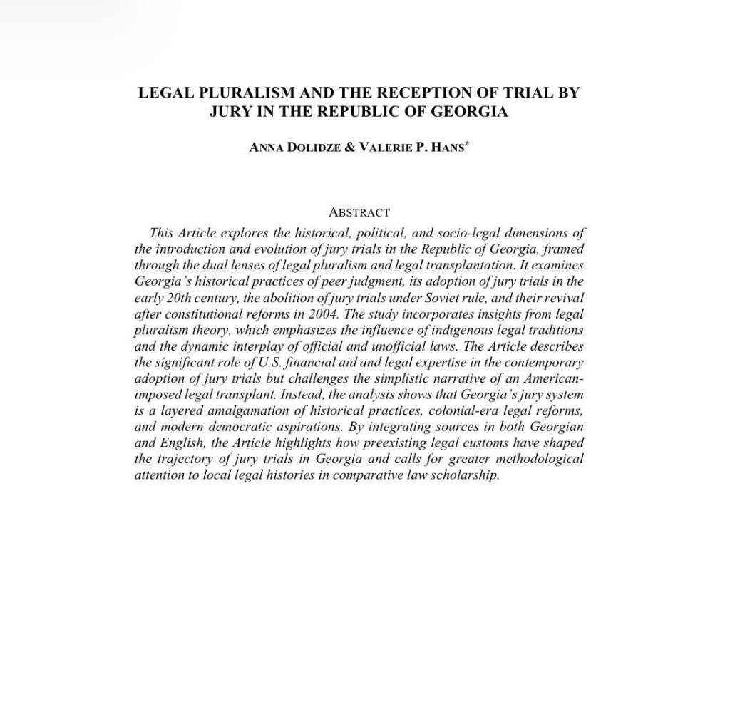 Boston University International Law Journal published Dr. Anna Dolidze’s article, Legal Pluralism and the Reception of Trial by Jury in the Republic of Georgia. The article is based on bilingual research, English and Georgian, and multi-year study of the Georgian archives.